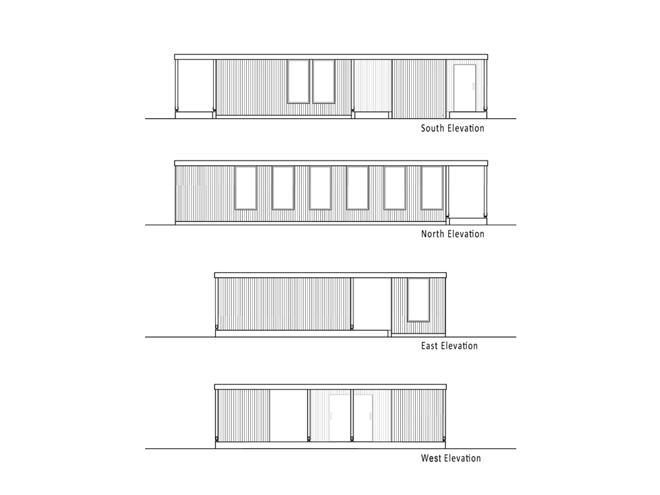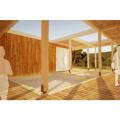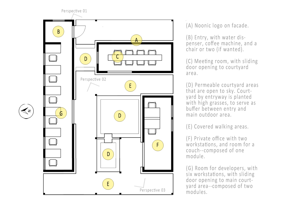 The design for the Noonic Creative Office is composed of three work modules linked through an exterior courtyard and covered walkway area.