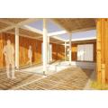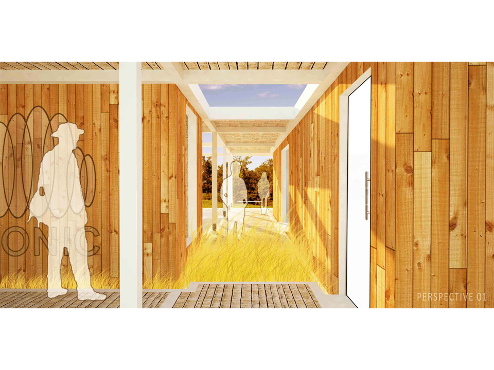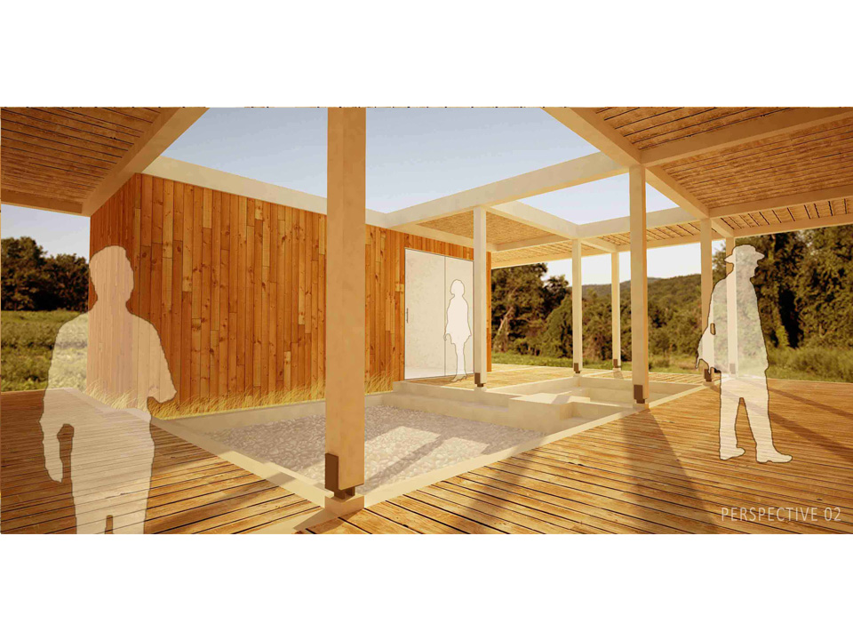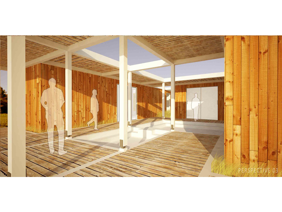 Courtyard area = includes covered and open areas, connecting rest of spaces.- Description