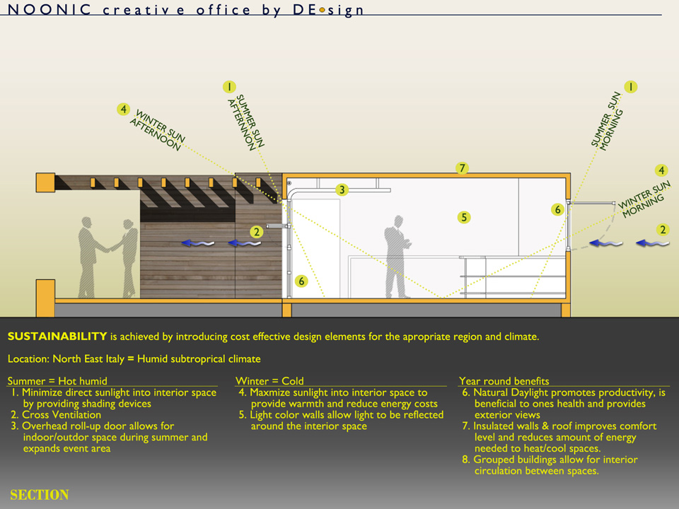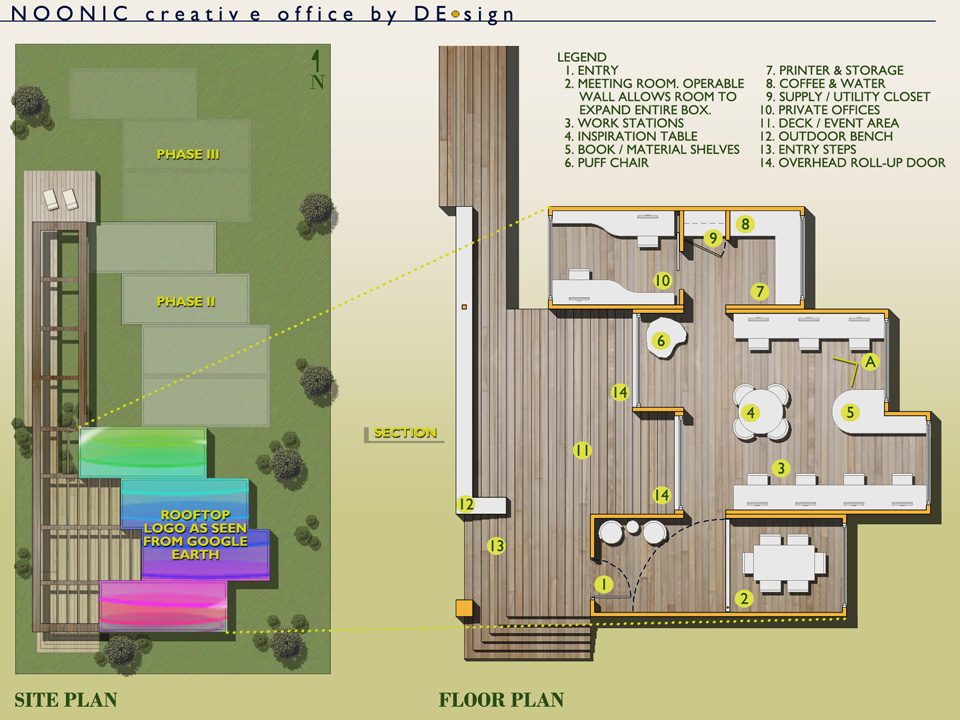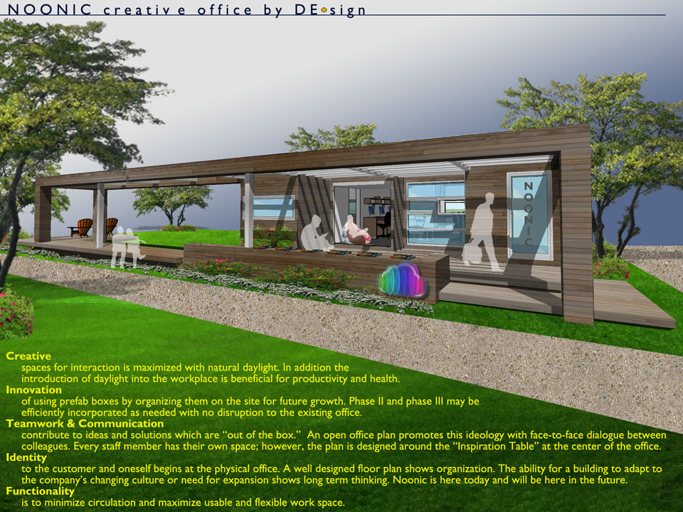 Architecture is an identity, another form of branding one’s company. In time Noonic will broaden their portfolio and expand as a company. Today the office requires four prefab boxes. In the future may it be doubled and tripled. Smart business decisions are based on where the company is going and not where it is. “Flexible Tomorrow” provides Noonic this option, to contemplate what lies ahead.