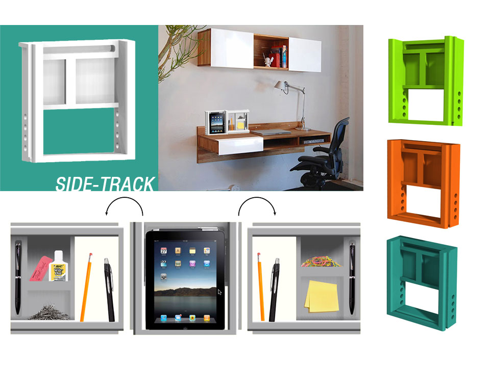 This project was designed as a modular unit with a main purpose as an ipad holder. The ipad will sit in the designated slot and a styllus may be placed in the pocket at the top of the unit. The unit can be rotated to double as a supplies holder for paper clips, rubber bands, pencils, etc. These units can be connected to each other by sliding together on a track system and being fit into place.