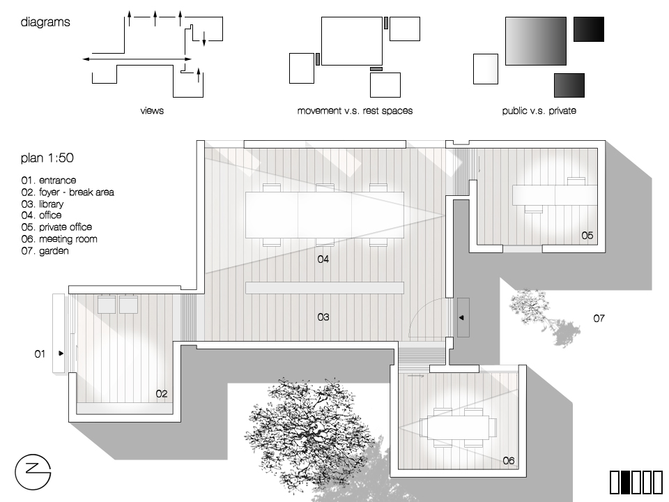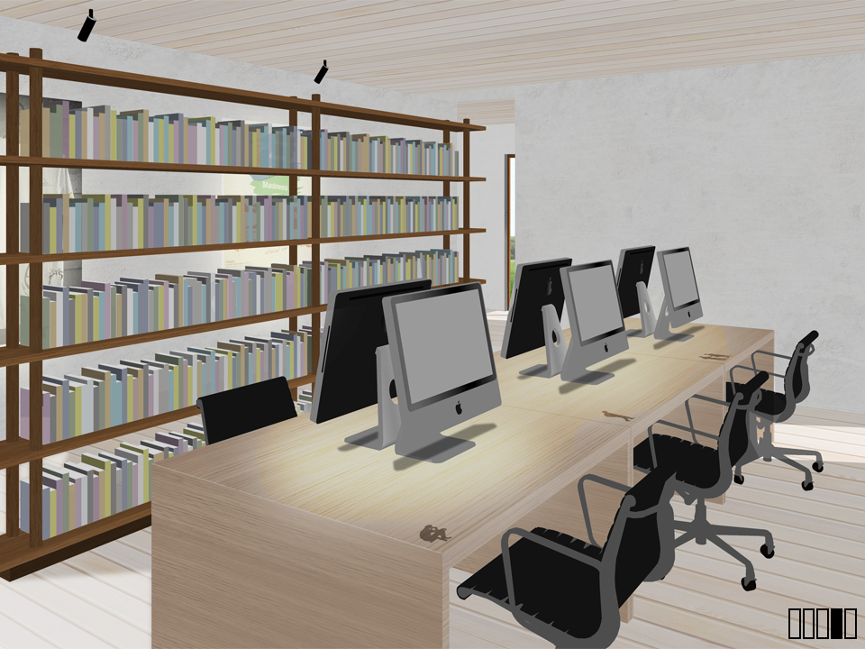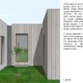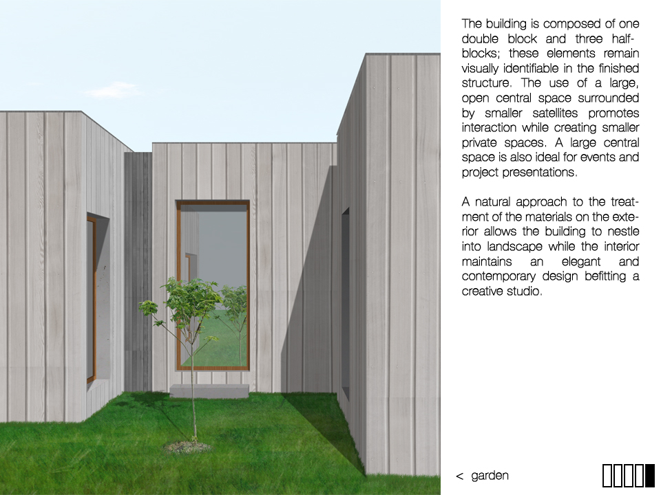 The building is composed of one double block and three half-blocks; these elements remain visually identifiable in the finished structure. The use of a large, open central space surrounded by smaller satellites promotes interaction while creating smaller private spaces.